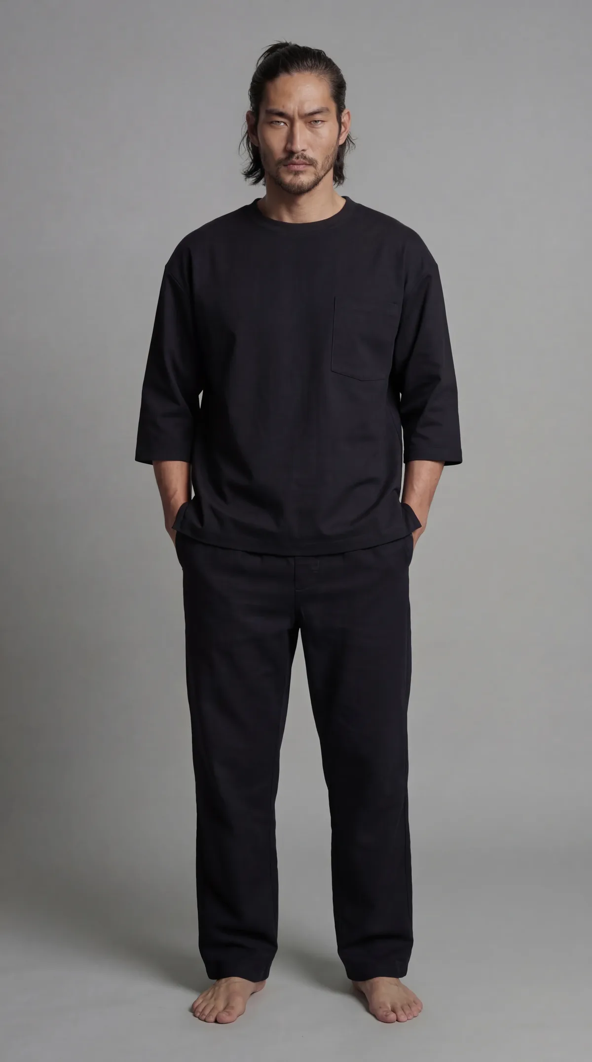 Нет. Костюм на размер больше — это неправильный размер: плечевой шов съедет, рукав будет болтаться, пропорции нарушатся. Настоящий свободный крой проектируется с нуля — другая линия плеча, другая ширина проймы, другая длина. Результат — свобода движений без мешковатости.