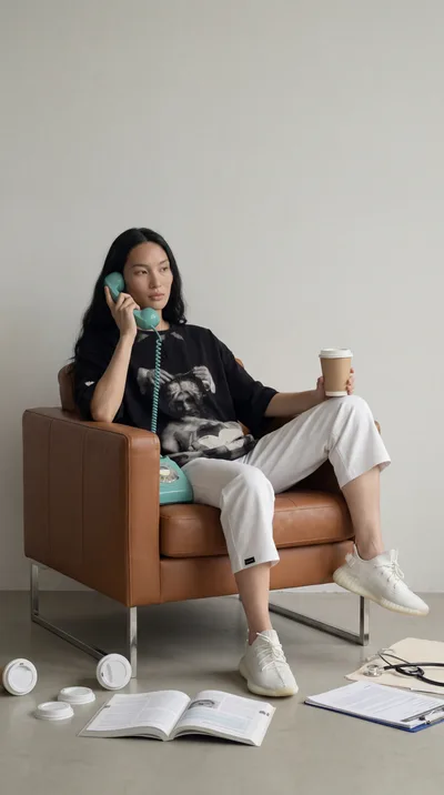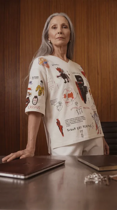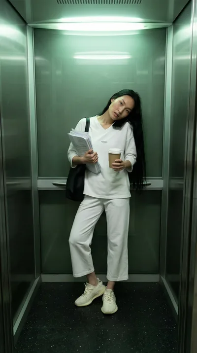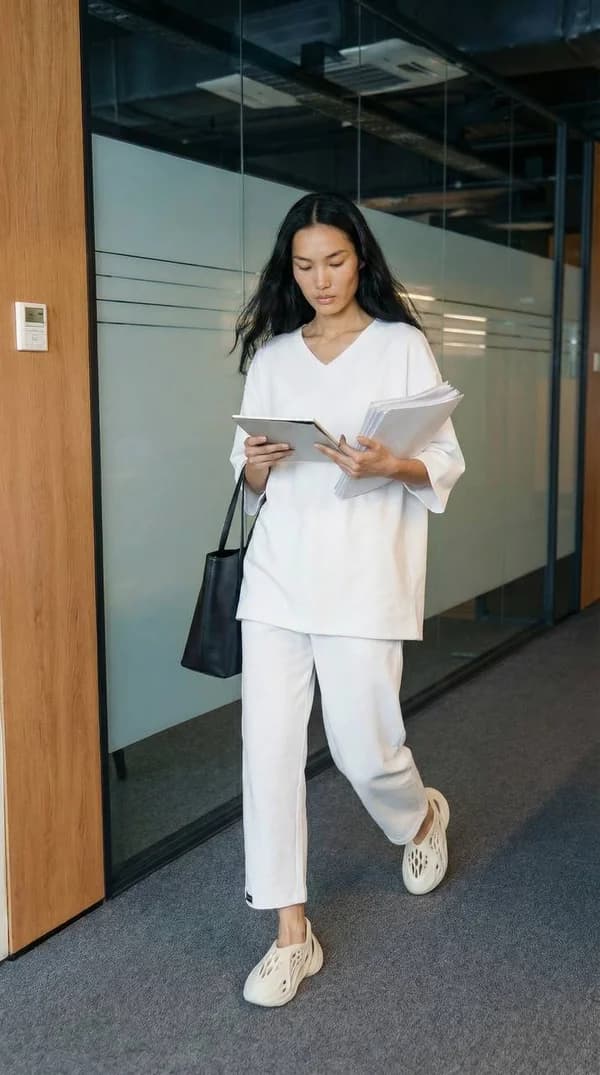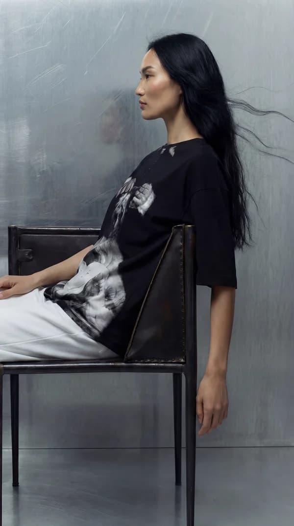 Оверсайз-крой, эластичный пояс, рукав 3/4. Можно поднимать руки, наклоняться к столу, работать с ассистентом — ткань идёт за телом.